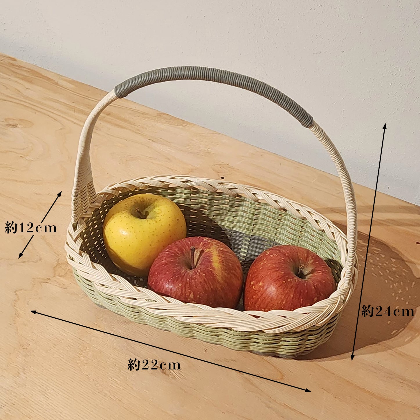 果物を並べて楽しめるように仕立てた、横長の持ち手付きかごです。
